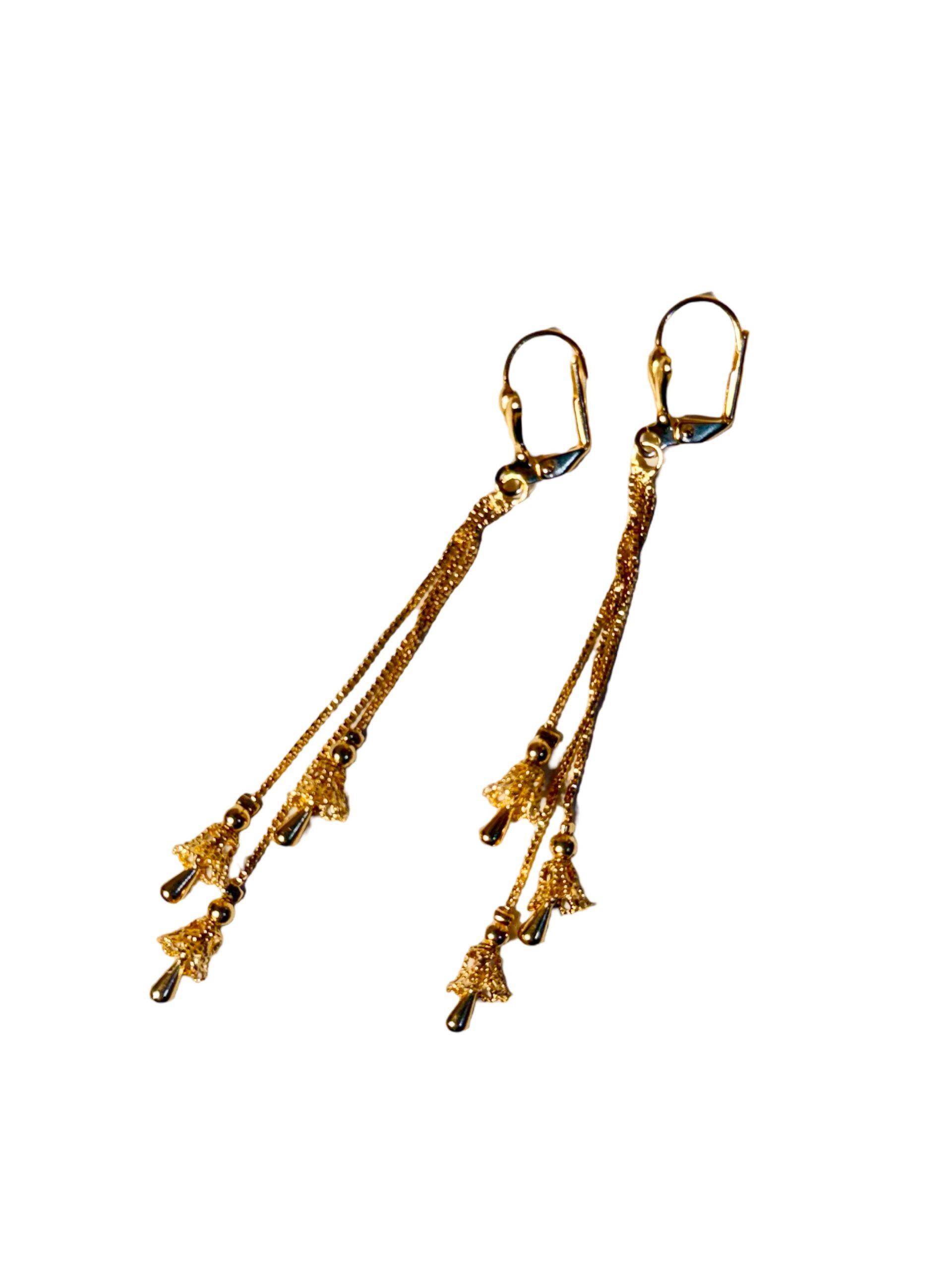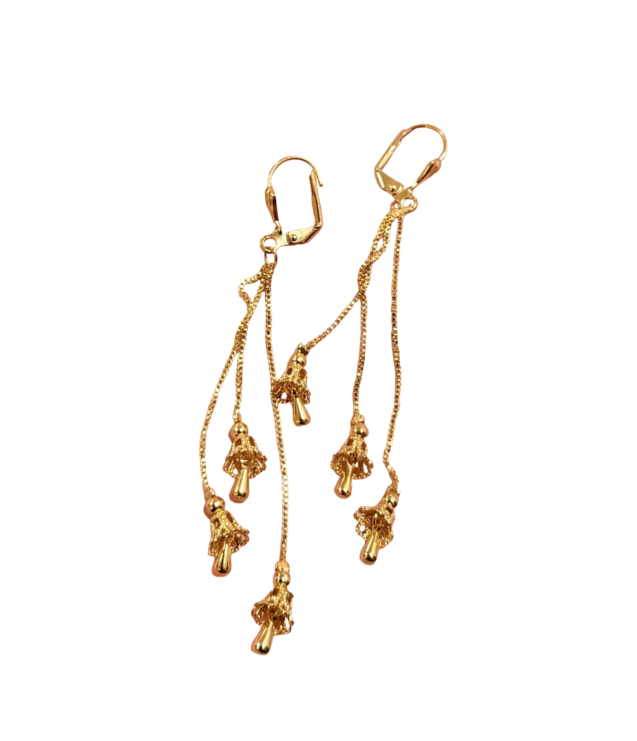 The Cascade Drop earrings feature fine gold chains arranged in layered strands, each finished with small sculptural gold charms shaped as jhumkas.